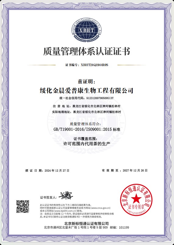 綏化金晨愛普康生物工程有限公司位于黑龍江省中南部地區的綏化市北林區,所處位置東經124度,北緯45度,位于松嫩平原的呼蘭河流域,“有寒地黑土,塞北江南”的美譽,是全國重要的商品糧基地,屬中溫帶大陸性季風氣候,四季分明,雨熱同期,冬季冰雪覆蓋,夏季降雨集中氣候溫熱濕潤。綏化金晨愛普康生物工程有限公司是一家專業從事健康養生產品研發、生產及銷售企業,公司占地總面積8000平方米,建筑面積5000平方米,公司周圍無任何污染源,是食品生產基地。公司生產車間潔凈度級別達到10萬級,同時擁有數十臺先進的生產設備及高科技檢驗儀器,從產品的原輔料、中間品、成品到銷售的全過程嚴格把關,使生產中每道工序都符合產品的高標準要求,從而保證了公司生產的每一袋產品合格,無質量缺陷。綏化金晨愛普康生物工程有限公司率先采用了企業資源ERP管理系統,肩負著養生產業的重要課題,同時又是江蘇省國家藥用植物重點實驗中心科研成果轉化的生產試驗基地,公司核心成員均為本科以上學歷。生產的產品有近五十個品種的代用茶產品,公司先后通過HALAL國際認證,編號為SSPY-201318-33849;ISO9001質量管理體系認證編號為XBH···